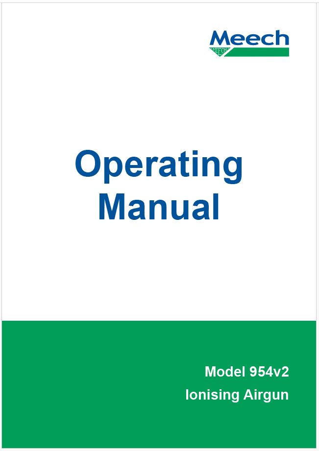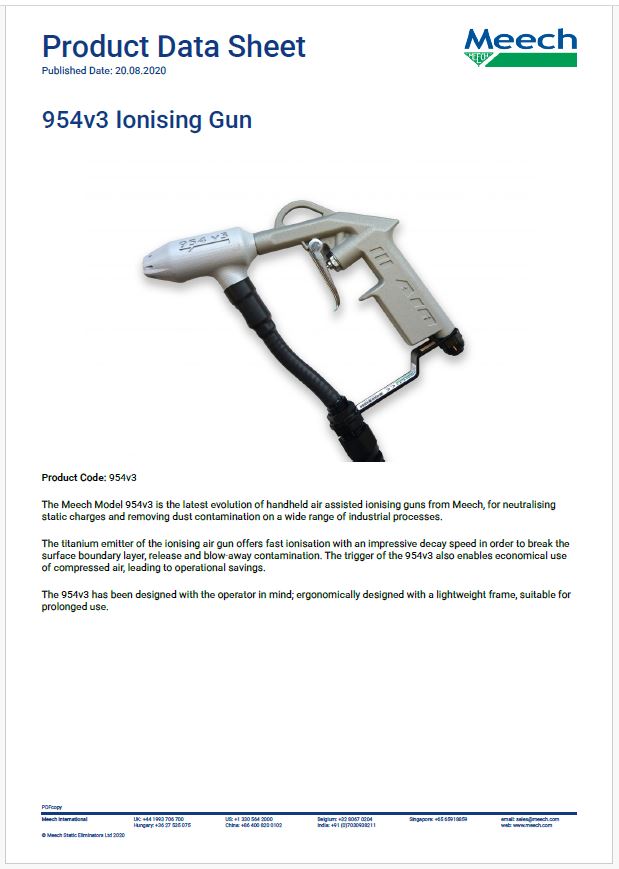 The Meech Model 954v3 is a handheld ionizing gun designed to neutralize static charges and remove dust in various industrial processes. Its titanium emitter ensures rapid ionization and quick decay speeds for effective contamination removal. The gun's trigger promotes compressed air efficiency, offering operational savings.