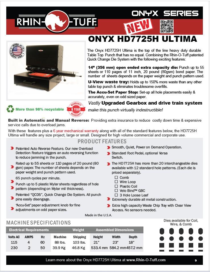 Diverse Punch Patterns - 20 interchangeable die patterns available in comb, wire loop, plastic coil, Velo bind, and 3 hole loose leaf