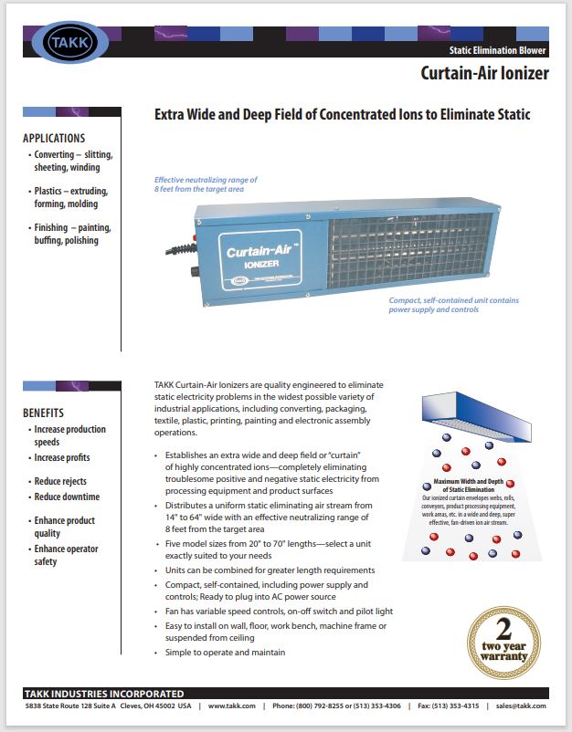 Each Curtain-Air unit creates an expansive ionization field, effectively forming a curtain of concentrated ions. This eliminates both positive and negative static electricity on processing equipment and product surfaces. Industrial applications include converting, packaging, plastic, printing, painting and electronic assembly.