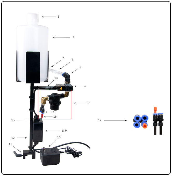 Includes the tank assembly, two score arm assemblies, two sets of 1" needles, a sensor and other standard parts (bar mount not included).